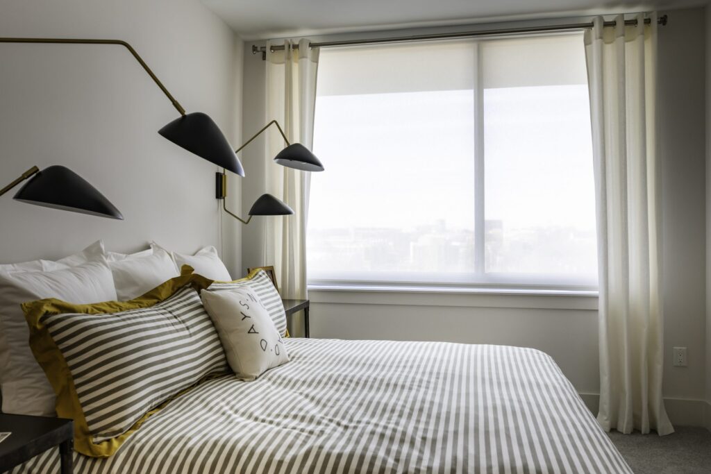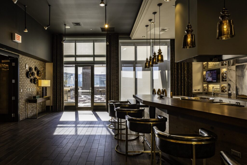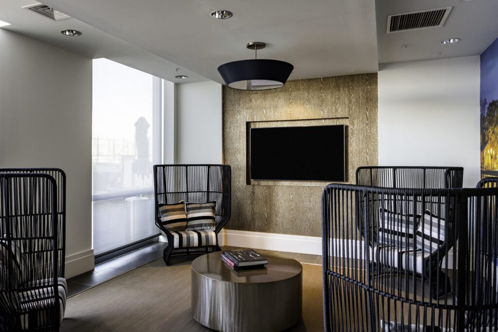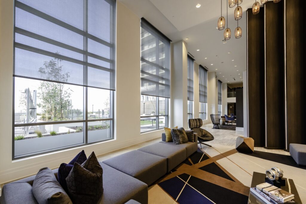 - Amenity areas have motorized Draper Flexshades with 5% openness to reduce glare and heat while maintaining privacy.