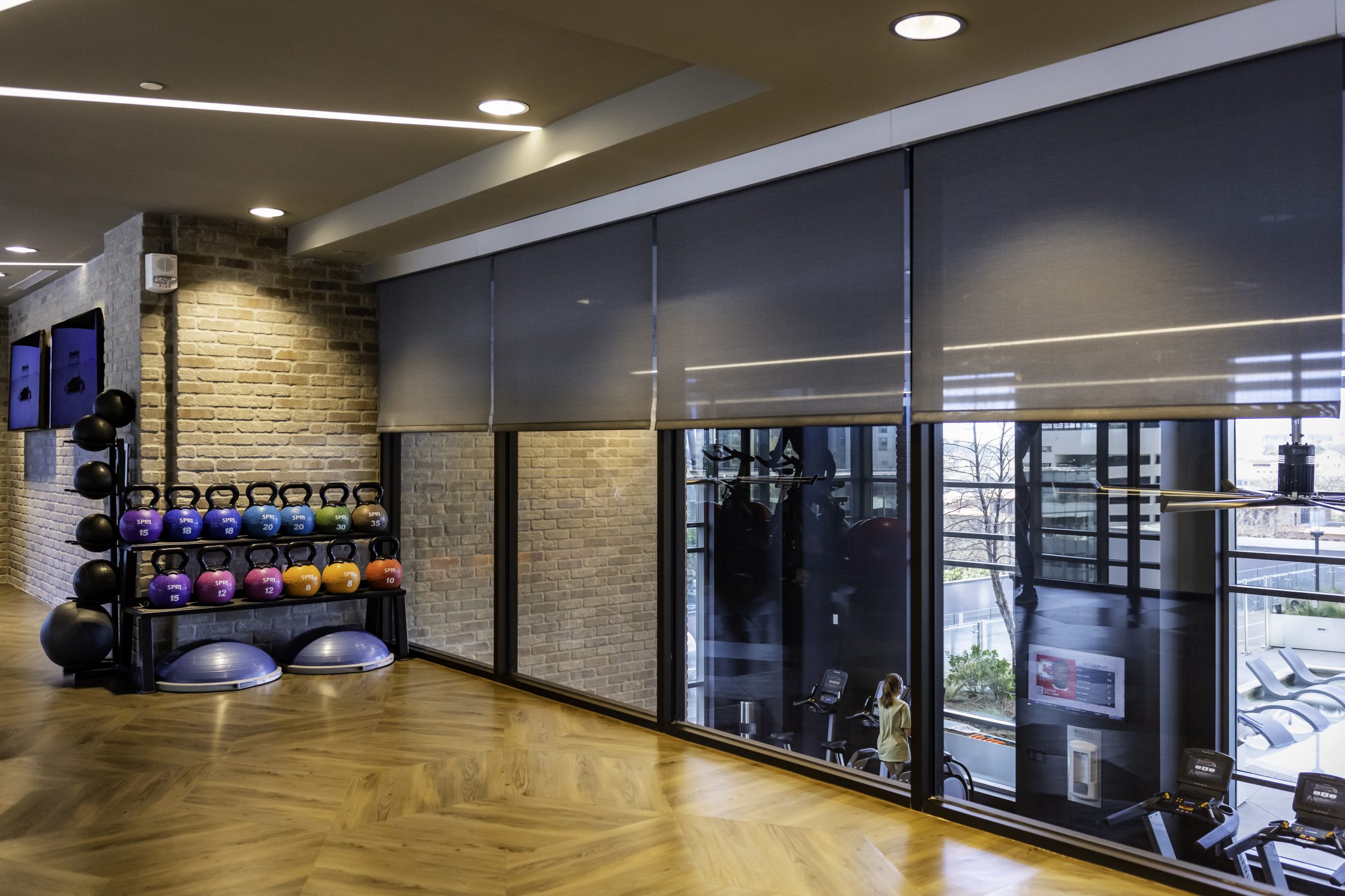 - Amenity areas have motorized Draper Flexshades with 5% openness to reduce glare and heat while maintaining privacy.